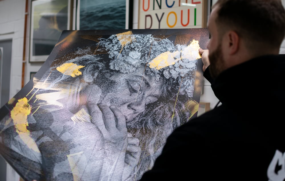 Hand painted with acrylic/spray paint originals with metallic leaf detailing on 330gsm Somerset paper. Finished with a silk screen varnish layer, each piece is unique with varying colour placements.